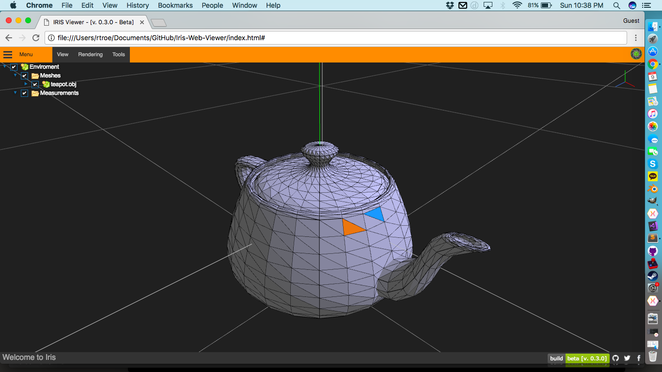 Below is the same Utah Teapot scene now with Hovering and Selection implemented using the Indexed Colour method. There’s two faces too note; The Orange shows a previously selected Face while the Blue is a Highlighted face.