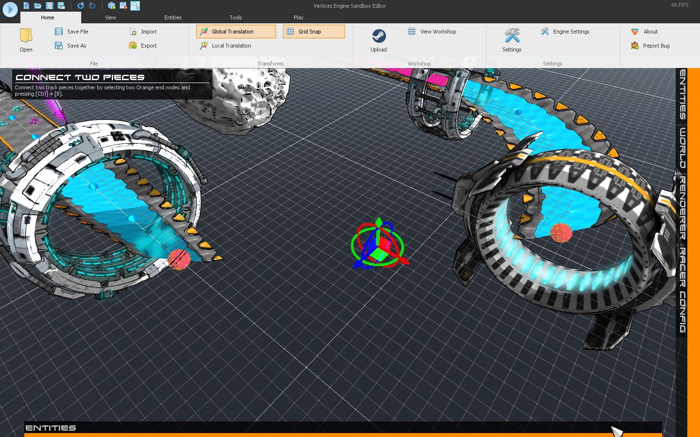I’ve added a number of bug fixes to the track editor, but one major addition is the ability to close gaps. By selecting two end track nodes and then pressing [Ctrl + B] you’ll close the gab between two track pieces. This ads a lot more flexibility to the tracks themselves. One note though is you’ll still need to re-work the AI nodes as you’d like.
